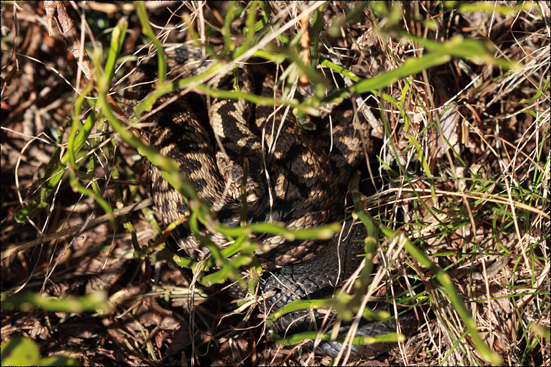 ...und siehe da, auf der rechten Seite des Bildes vor den Büschen liegt eine schwarze Kreuzotter.